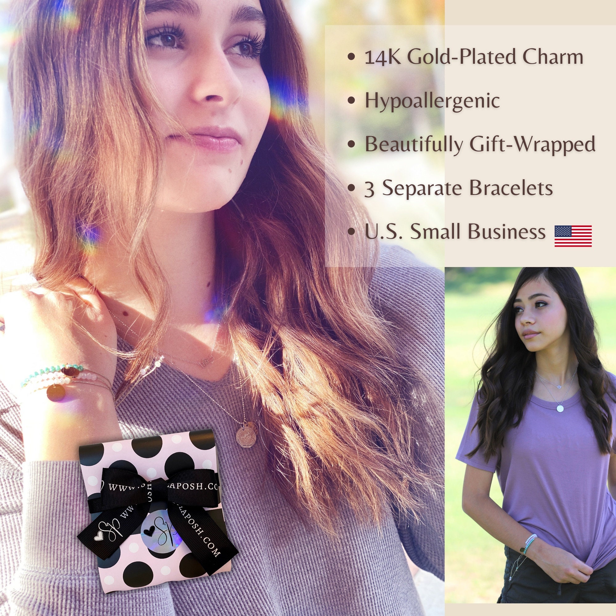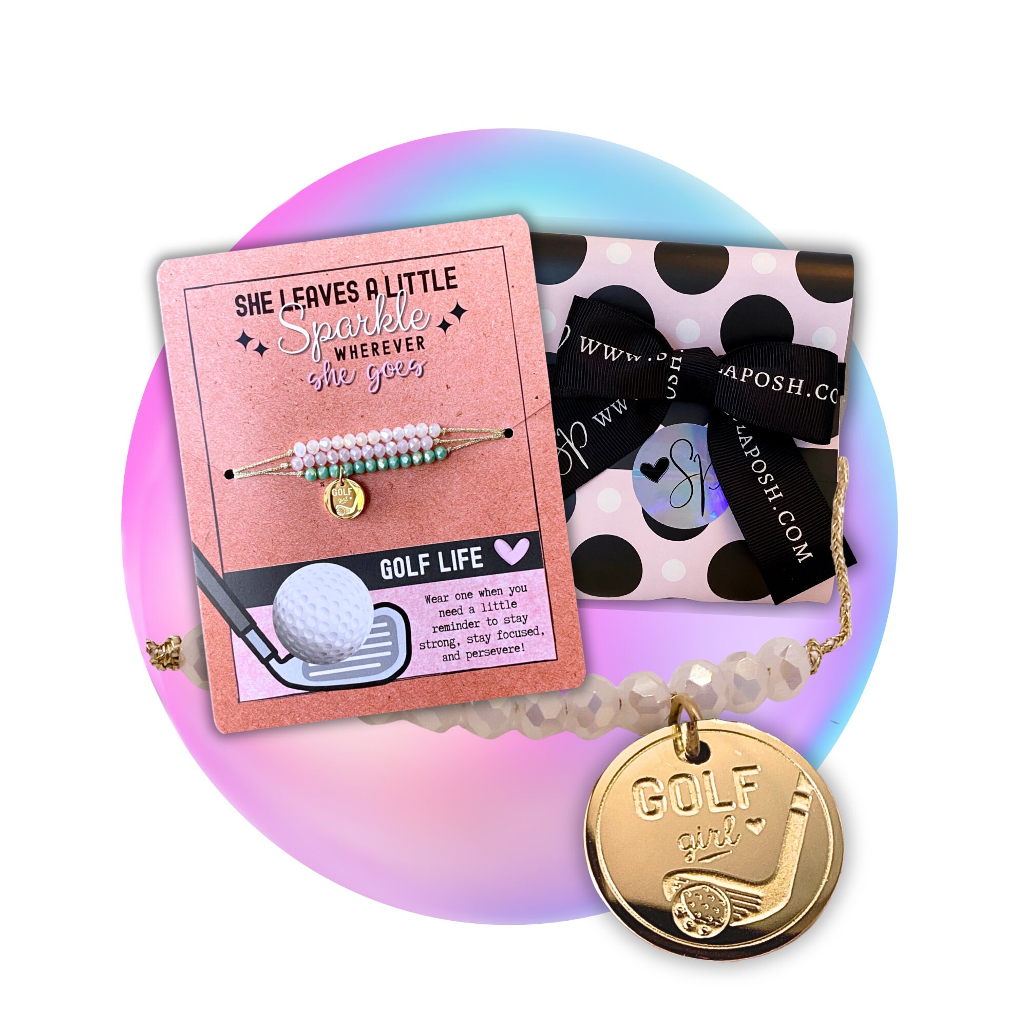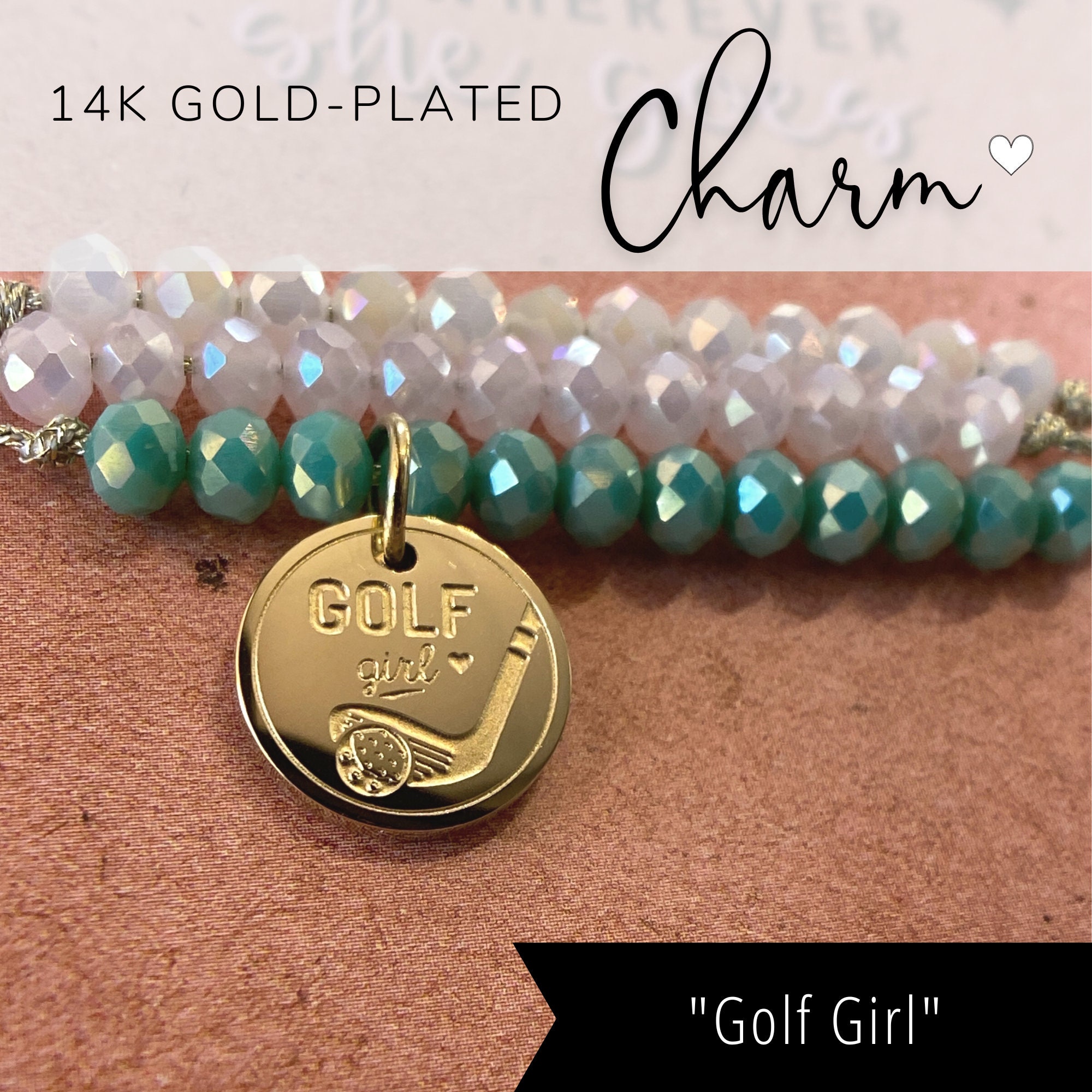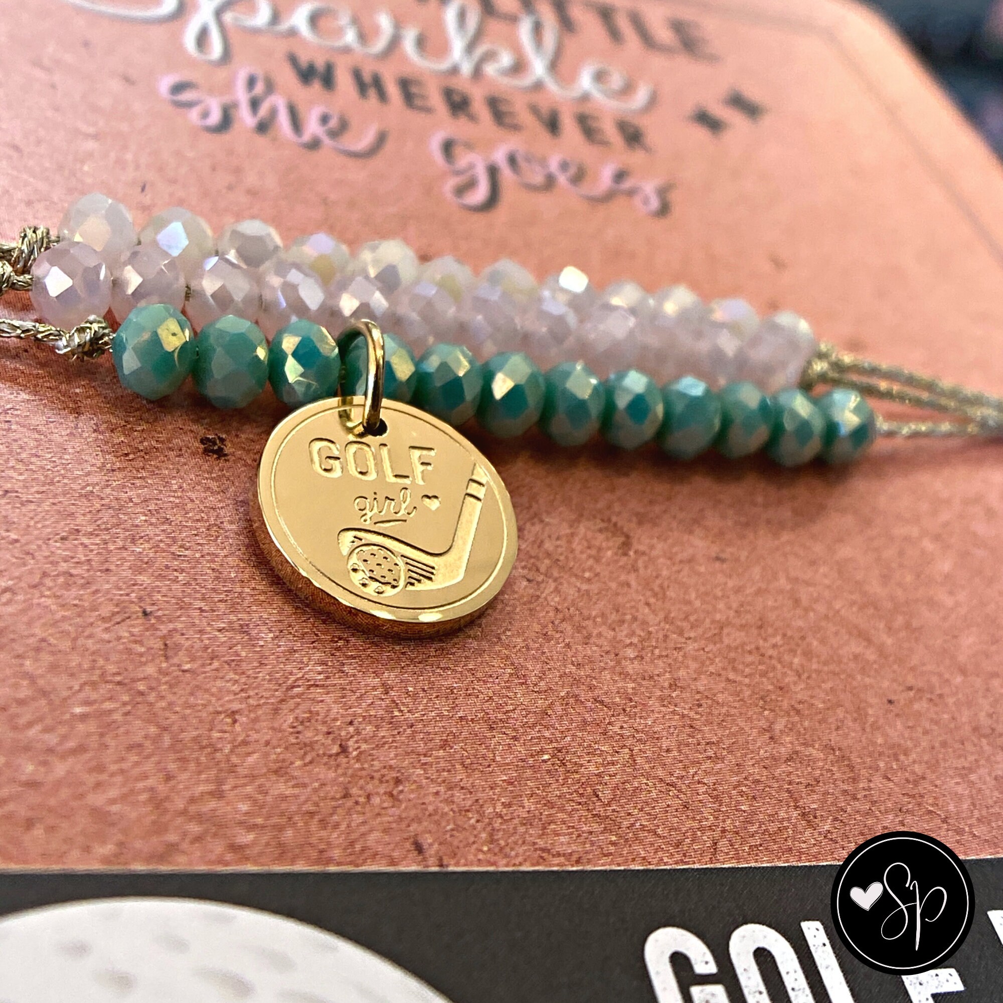 This golf bracelet is the perfect gift for any female golfer! The adorable charm is 316L Stainless Steel, plated with real gold. Iridescent glass beads add the perfect amount of subtle sparkle for any style. Adjustable length fit women and girls, bracelets are separate and can be worn individually. Designed, assembled, and shipped in adorable packaging from a small business is Arizona, USA! All bracelets are packaged in polka-dot envelope as shown, no additional charge.
