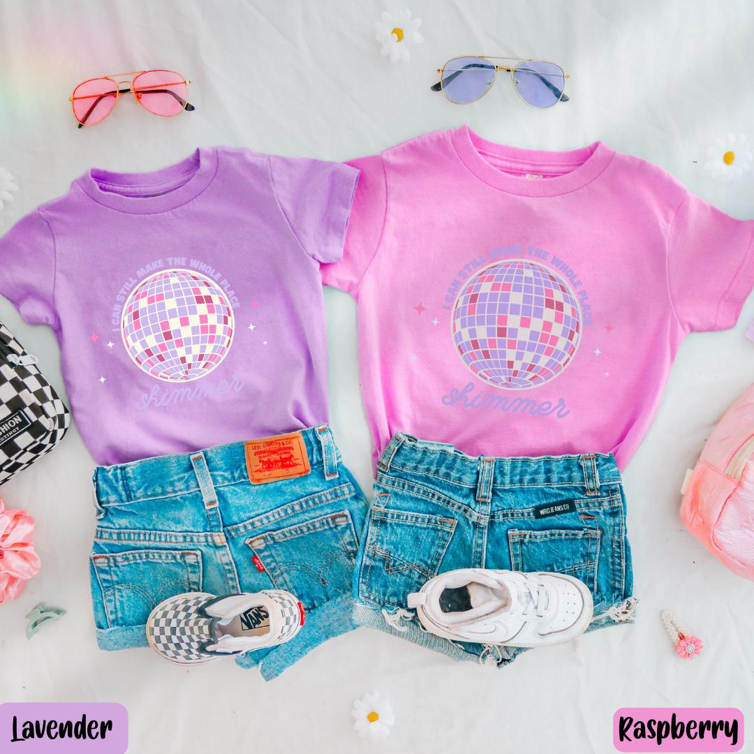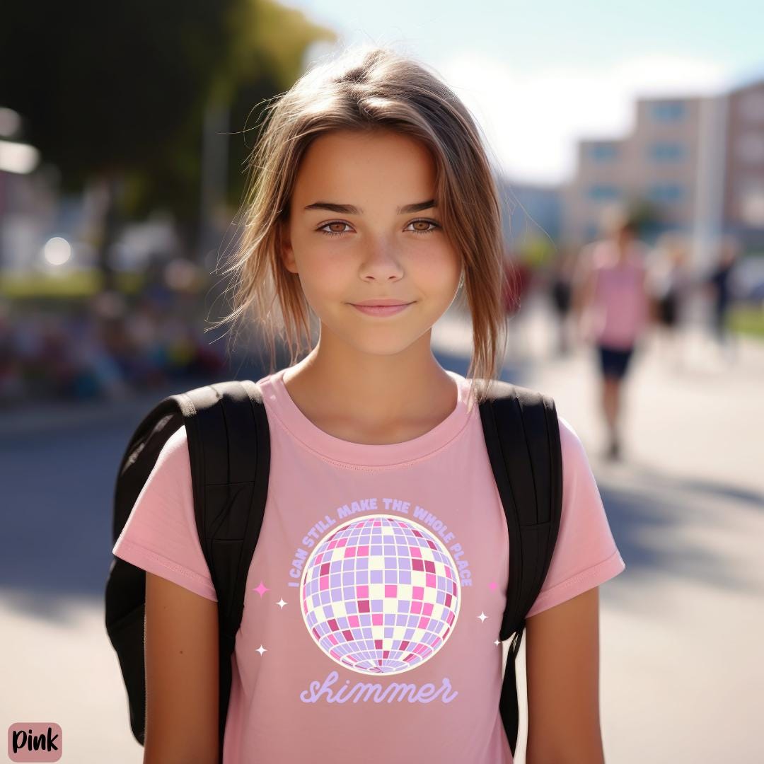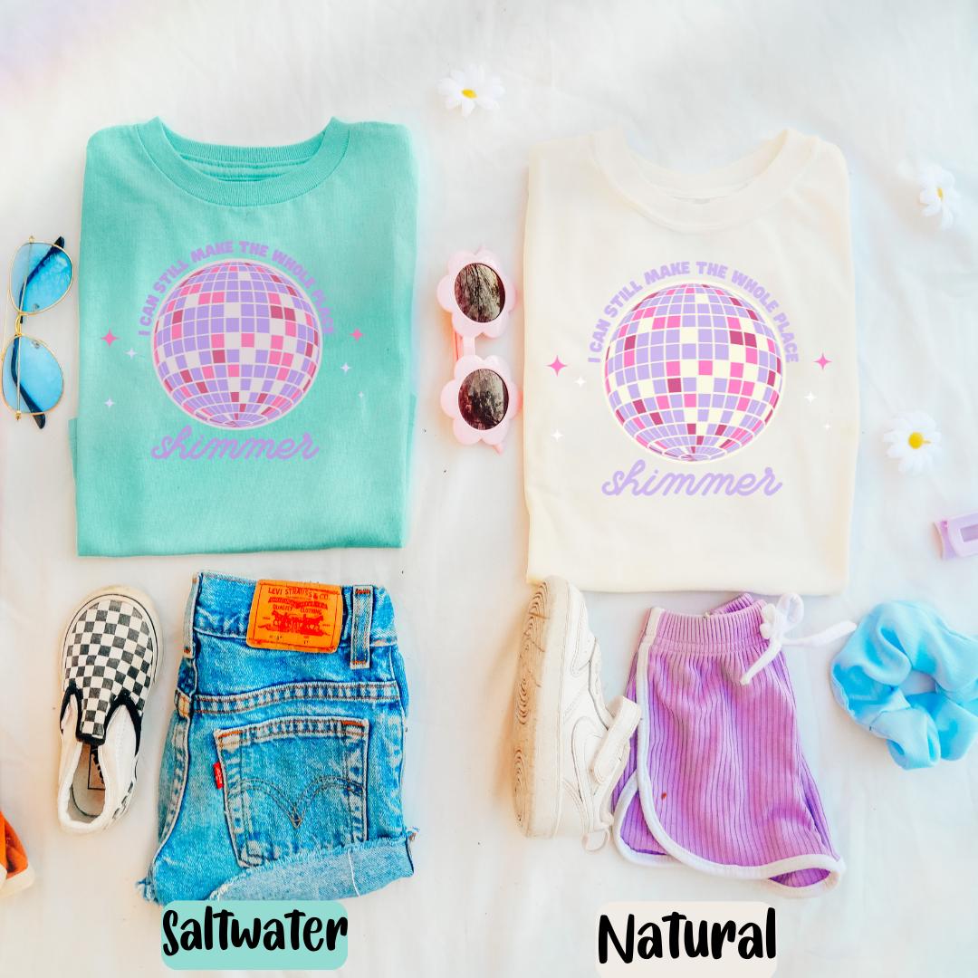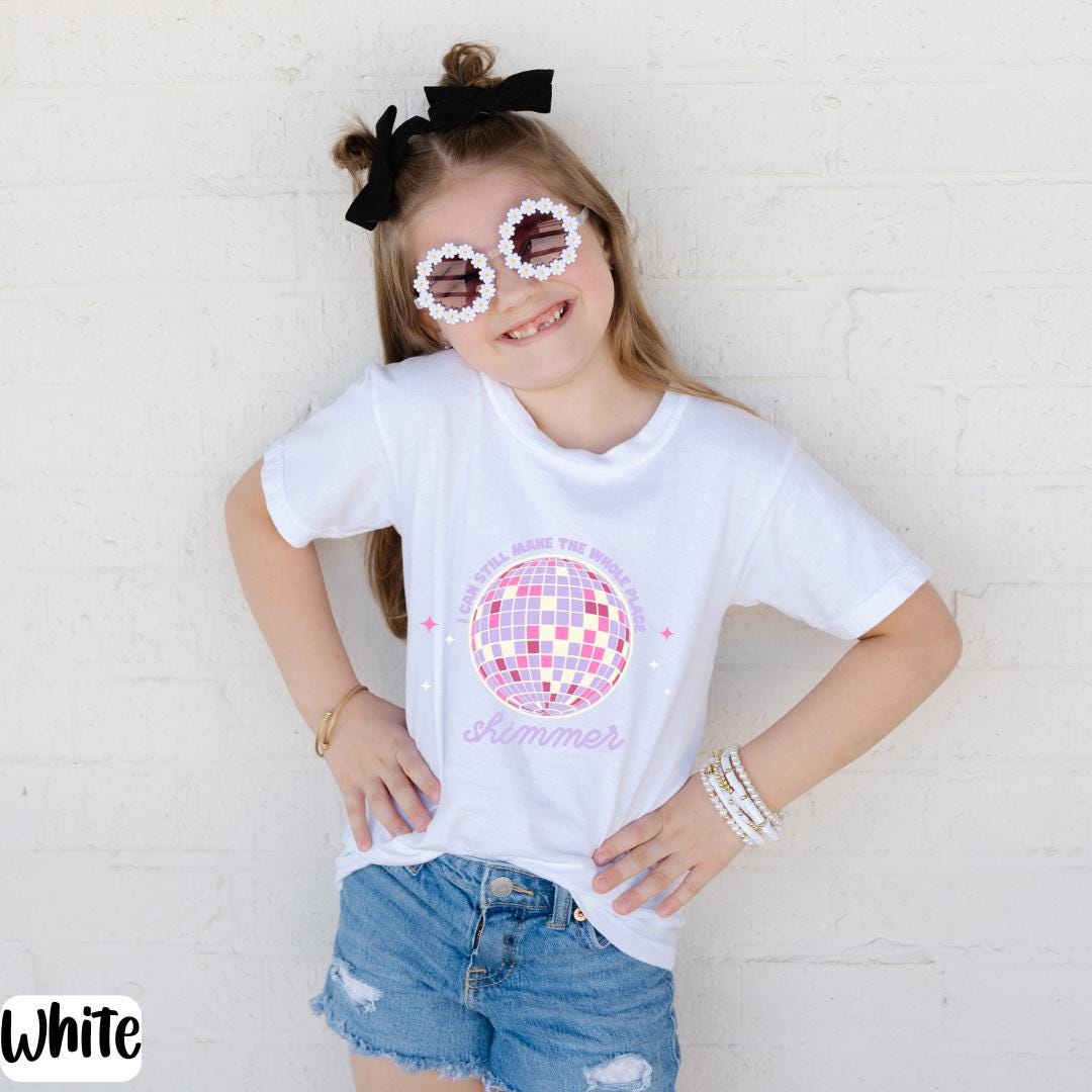 Introducing our I can Make the Whole World Shimmer T-shirt! A whimsical design that features a beautiful Disco ball front and center of the shirt with an adorable phrase that will make any music lover happy!