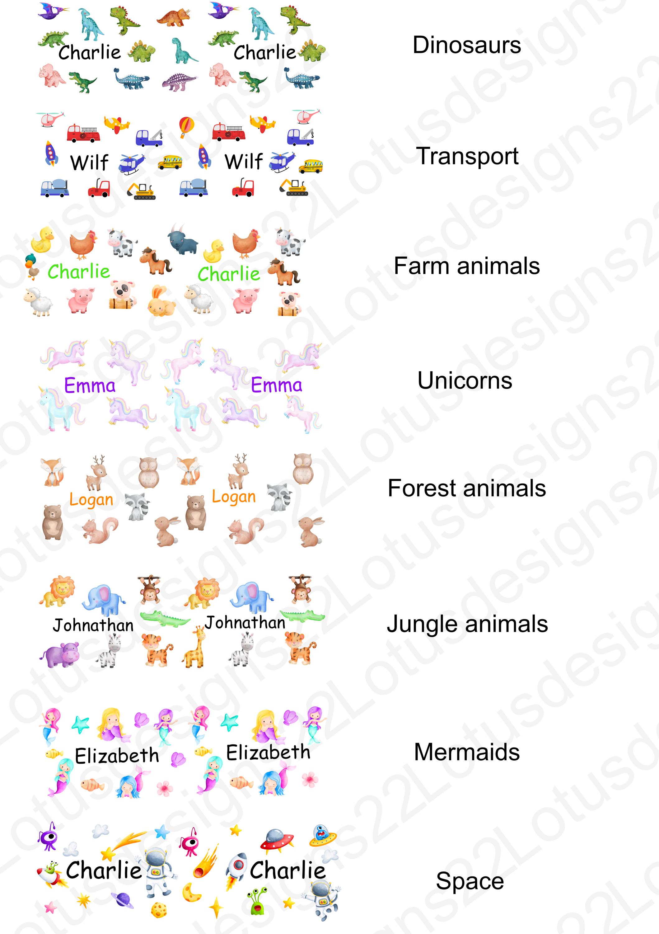 Each design has a the children’s name on each side with a collage print of their chosen designs going all the way around. (please note this can only be personalised with one name around 11 characters, if you need more like double named I will try my best to fit it on but may need to go on to line and some design removed 😊 )