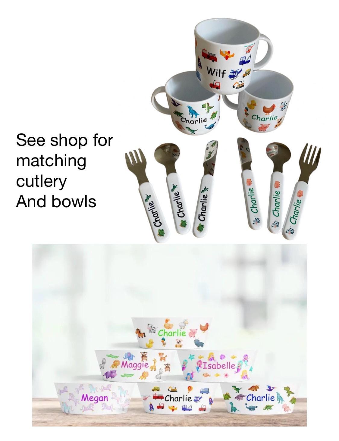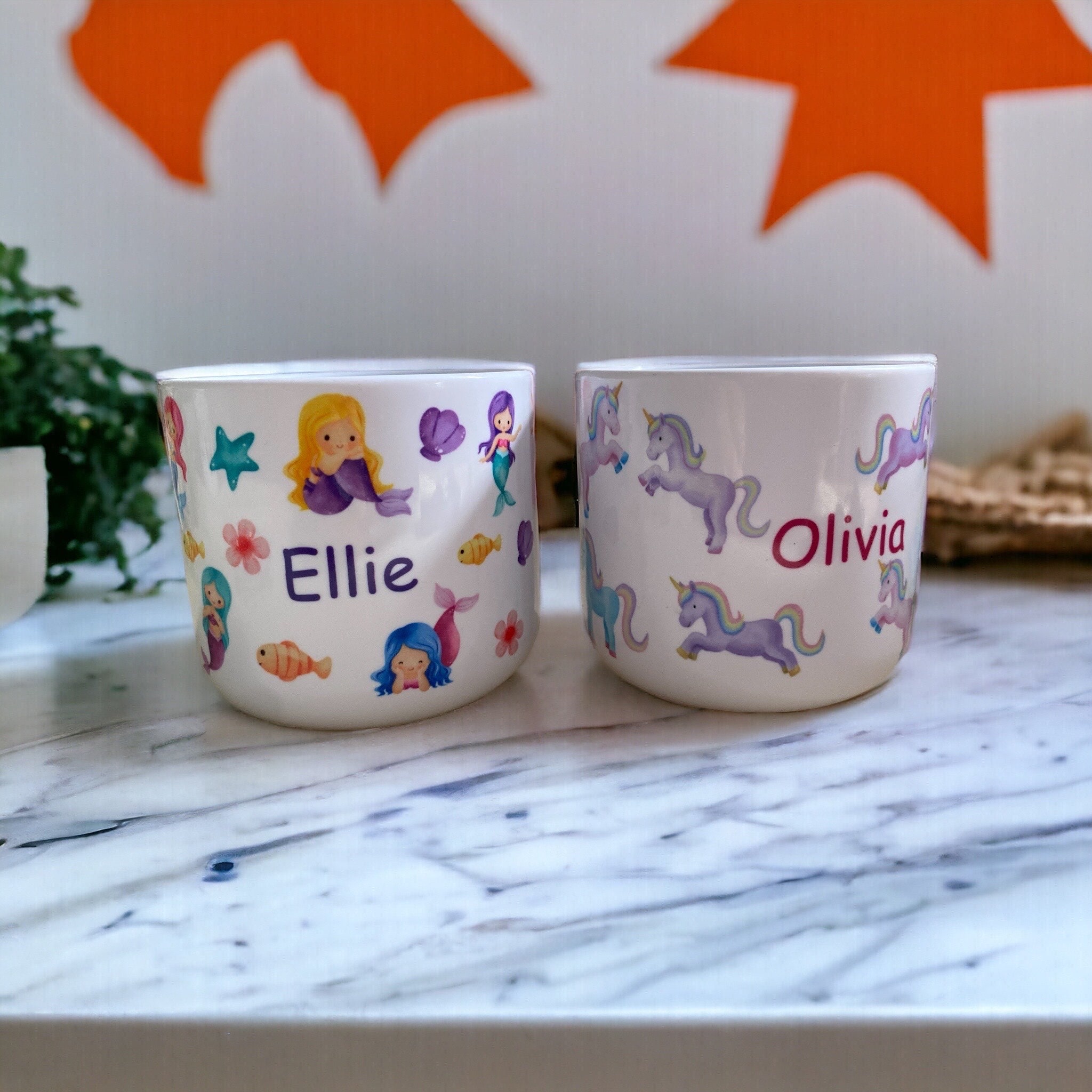 These cups are 6oz made from white polymer and are unbreakable. They have 7 different designs to choose from, which can be personalised with any name with a range of colours.